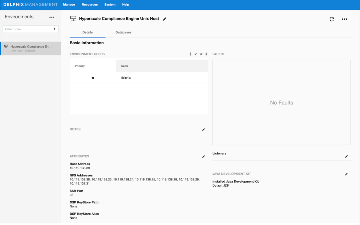 After the discovery is completed, configure the same Unix host on the Environments screen such that the IP addresses of the Hyperscale Compliance Orchestrator Unix host along with the Continuous Compliance Engines part of the Continuous Compliance Engine cluster are populated in the NFS Addresses field. This is done to ensure that the empty VDB is shared with both Hyperscale Compliance Orchestrator and the Continuous Compliance Engines part of the Continuous Compliance Engine cluster.